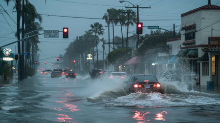 high winds and waves battering the streets of a tiered coastal city, with cars navigating through puddles while palm trees sway in the gusts, all under an overcast sky with rain pouring down