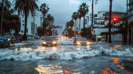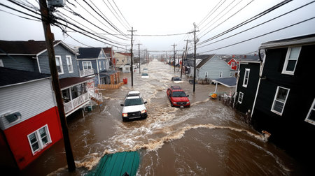 An AI generated illustration of a flooded street filled with cars