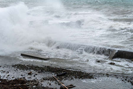 Large waves hit the shore. Storm at sea, storm warning on the coast. Thunderclouds and large sea waves during a storm.