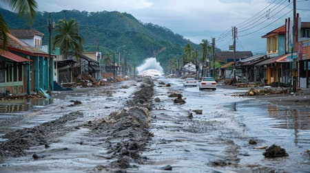 The effects of the tsunami in the city. Global warming has led to many new environmental disasters, such as river overflows and floods.