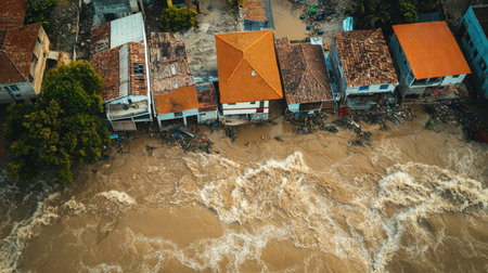 Aerial view of houses flooded with dirty water of a river. Buildings and cars submerged in water during an overflow of water. Generative AI.