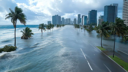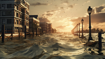 A coastal city with rising floodwaters encroaching on buildings, showcasing the impact of global warming on sea level rise and coastal areas