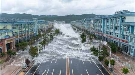 Dramatic urban wave flooding desolate city street with intense energy.