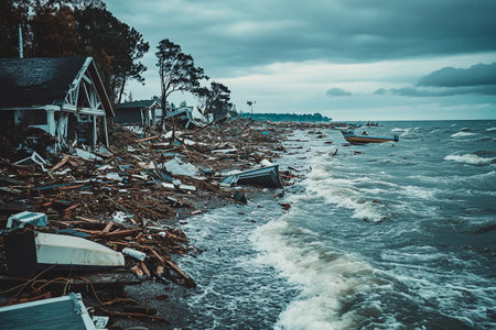 A devastated shoreline showcases uprooted debris and damaged structures after a fierce storm swept through.