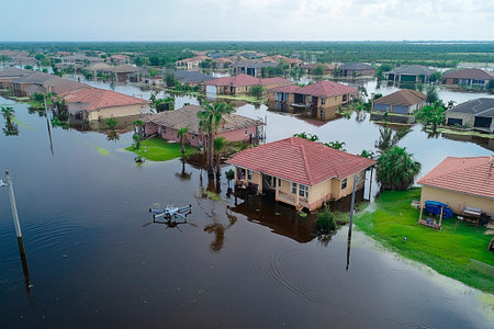 Aerial view of a neighborhood heavily affected by flooding, where homes are partially submerged in water. A drone hovers above, capturing the extent of the disaster during daylight hours.