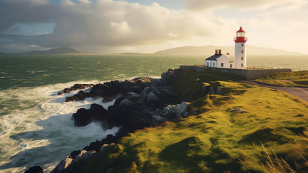 A breathtaking view of a lighthouse on a grass-covered hill by the ocean on a cloudy day
