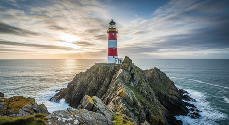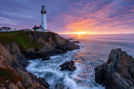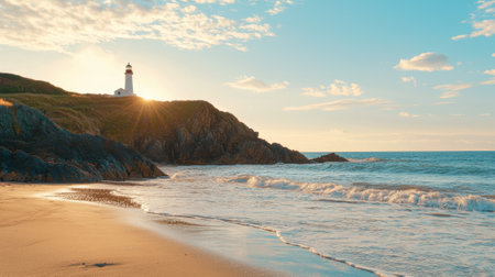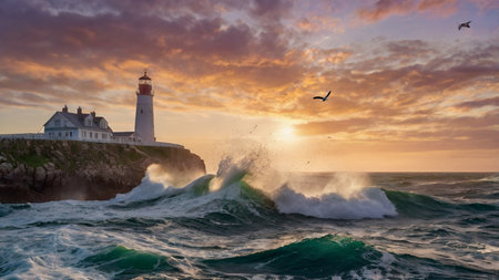 a scenic lighthouse stands tall against a vibrant sunset, overlooking the vast and beautiful ocean.