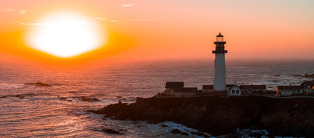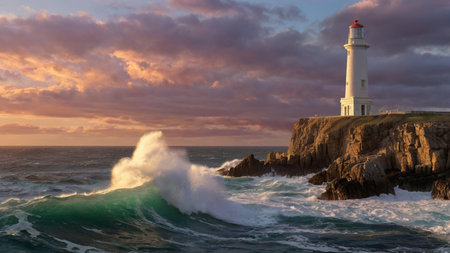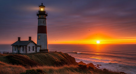 a scenic lighthouse stands tall against a vibrant sunset, overlooking the vast and beautiful ocean.