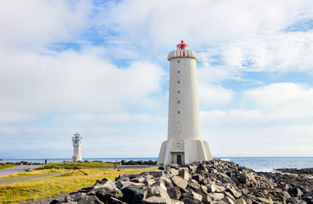 Akranes lighthouses on the west coast of Iceland. Bigger lighthouse is operational and smaller is deactivated old one. White building by the sea on sunny beautiful day.