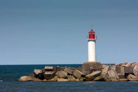 Seascape. A decorative lighthouse stands on a peninsula surrounded by calm water in the sun.
