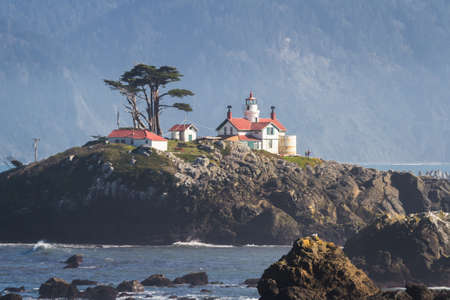 Tidal island just offshore Crescent City California home to one of the most visited structures in Del Norte County , Battery Point Lighthouse seen here at low tide with a bit of mist in the air against the dark mountains in the background.