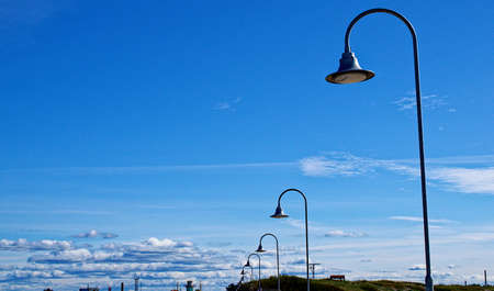 Blue sky with clouds and street lights in Ventspils, Latvia.