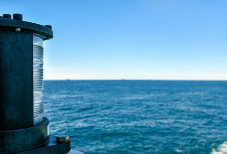 Position light at the stern of a ship during the voyage across the sea. View towards the horizon.