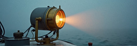 Vintage nautical spotlight illuminating foggy sea horizon at dusk.