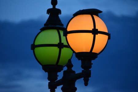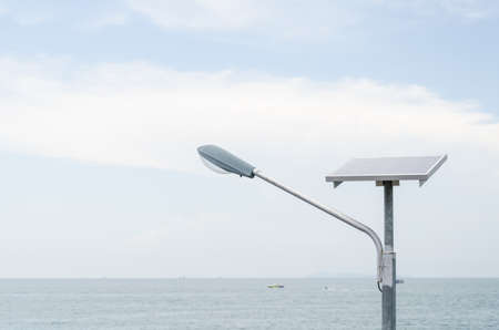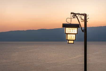 Sunlight shines through a lamp on the pier, beautiful sunset sky and sea background
