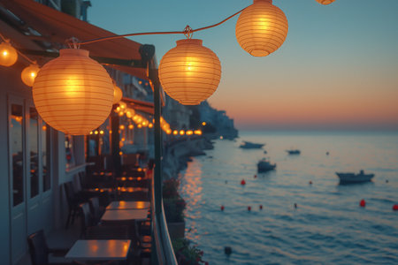 Lanterns on the terrace of a restaurant in the sea at sunset