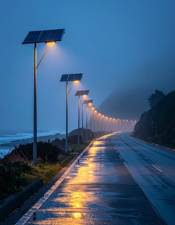 As twilight settles over the misty coastline, a row of solar-powered streetlights casts a warm, golden glow on the wet asphalt.