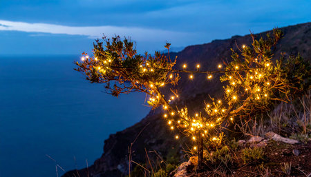 As twilight settles over the calm sea, a lone tree on a rugged cliffside comes to life, its branches adorned with a cascade of warm, glowing fairy lights. This magical and enchanting scene evokes a sense of peace, romance, and quiet celebration, perfect for conveying wonder and serenity.