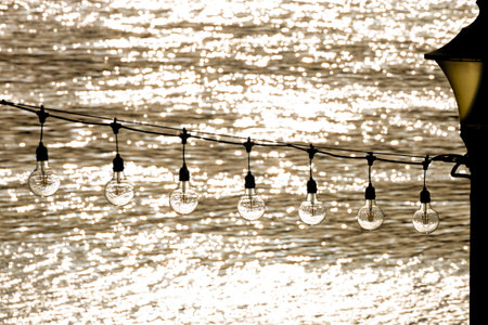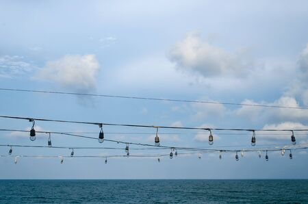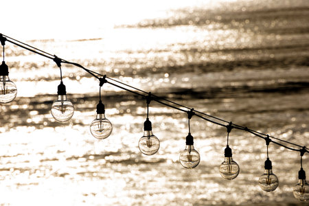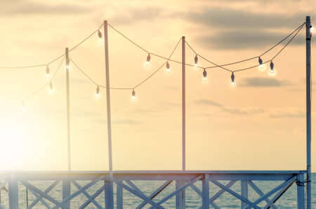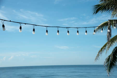 light bulbs on string wire decoration at the party event festival on the beach at sunset. Outdoor holiday background. Copy space