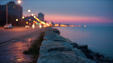 A close-up perspective showcases a weathered concrete embankment alongside rippling ocean water. The soft focus background displays city lights along a road, while the sky transitions from pink to deep blue. This tranquil scene could be suitable for various commercial or editorial applications.