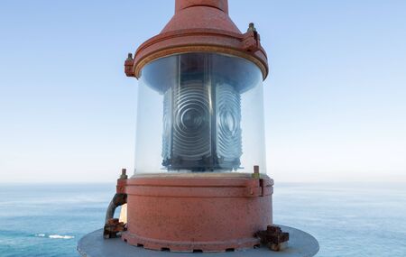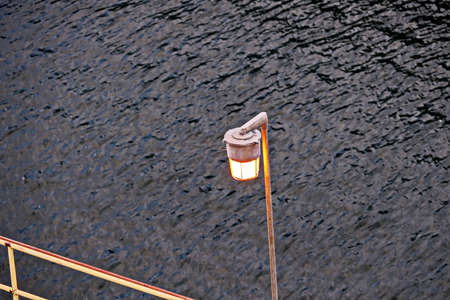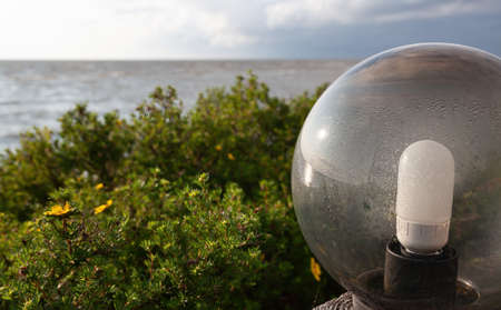 Vintage lamp light close up. It is next to the sea, which can be seen as a blurry background.