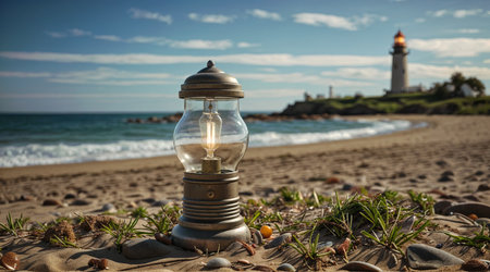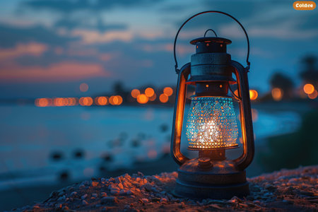 As twilight settles over the bay, a vintage lantern casts a warm, inviting glow.