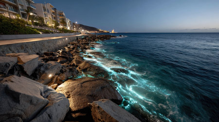 Captivating coastal view at twilight showcasing the vibrant energy of illuminated waves crashing against picturesque rocks along the waterfront properties.