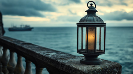 Aged lantern resting on a balustrade, with the salty sea breeze and distant ships in the background.