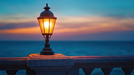 Vintage-style lantern attached to a stone balustrade, glowing against a twilight sky over the sea.