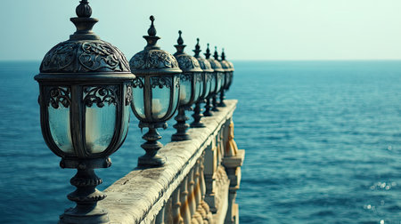 A row of elegant lanterns lining a seaside balustrade, leading the eye toward the open ocean.