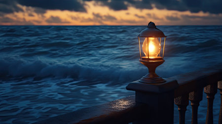 A romantic evening scene with a glowing lantern on a seaside balustrade, waves gently rolling in.