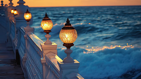 Ornate lanterns casting a warm glow on a white balustrade by the shore, with waves rolling in.
