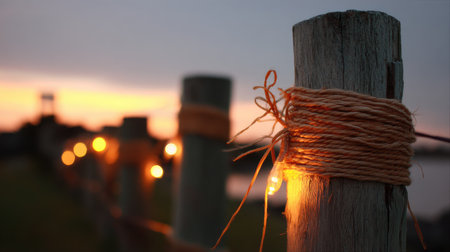 Experience a tranquil evening scene featuring rustic wooden posts adorned with soft string lights, creating a warm atmosphere against a colorful sunset sky.