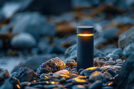 A glowing light bulb placed on a rocky beach during sunset, creating a warm and innovative atmosphere blending nature and creativity.