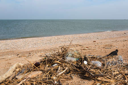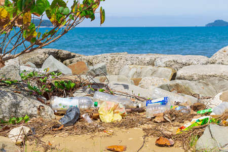 Spilled garbage on the beaches of big cities The used plastic bottle is dirty. Dirty sea, the coast of Thailand Environmental pollution Ecological problems
