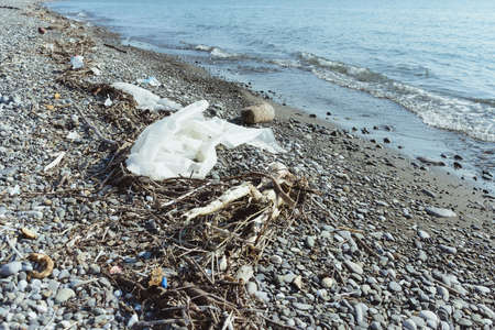 garbage and trash on dirty pebble beach of Black Sea in Sochi of Russia, environment concept, stock photo image
