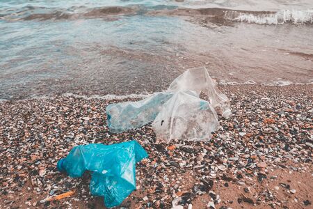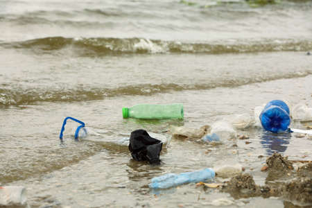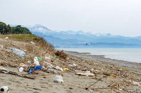 Seashore contaminated with plastic and other debris. Global problems of environmental pollution
