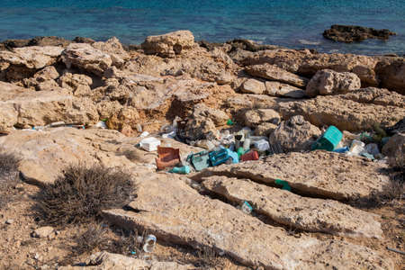 Garbage on the seashore in the North coast of Crete, Greece.
