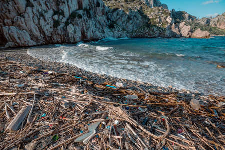 Pollution: garbages, plastic, and wastes on the beach after winter storms.