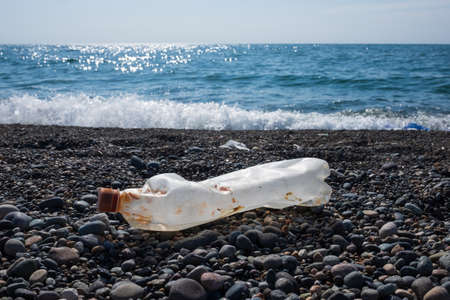 Bottles by the sea. Garbage on the shore. Save the planet.