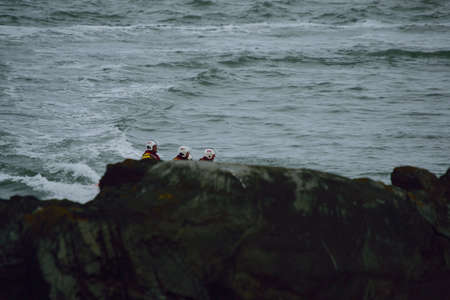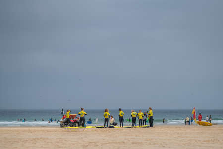 St. Ives, England - May 2018 : Group of surfing adepts listening to the surfing instructor on the beach, Cornwall, UK