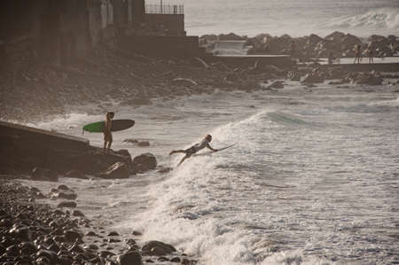 Azores, Big waves crashing over black volcanic rock on the Atlantic Ocean in the coast of Sao Miguel island in the Azores, Portugal