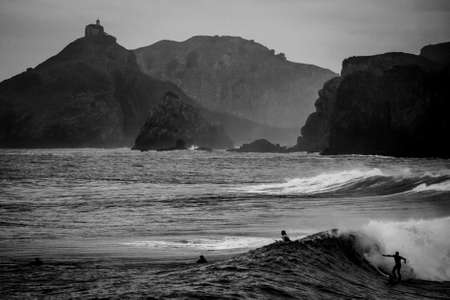 Surfers and waves in the distance near Cannon Beach in the Pacific Northwest, Oregon, USA.