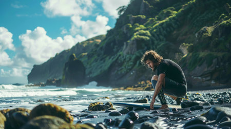 Man Kneeling on Rock Covered Beach