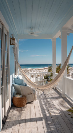 An inviting porch features a hammock, pillows, and a wicker chair, inviting relaxation. The view from the porch showcases the ocean and beach on a bright day. This image could be used for promoting leisure, travel, or lifestyle content.