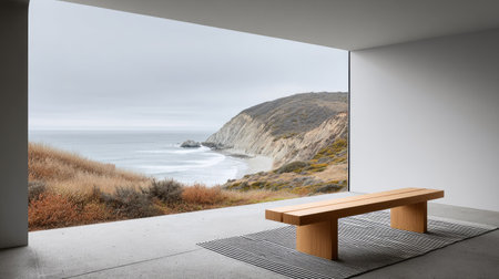 An interior space features a wooden bench placed on a textured rug, overlooking a coastal landscape. The scene showcases natural light and muted tones, with a view of a hillside and the ocean. Suitable for illustrating architectural design, lifestyle content, and conceptual projects.