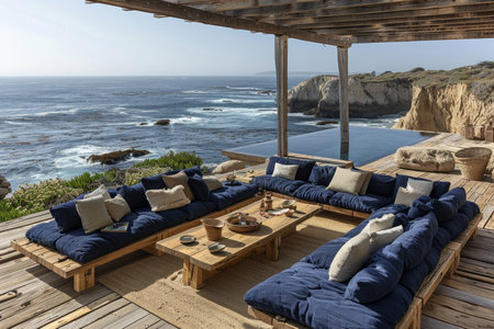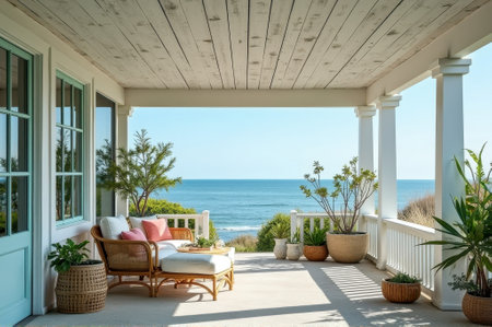 Serene oceanfront porch with cozy seating and scenic views. That the image is generated using AI.