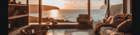 Coastal retreat interior with ocean view and rustic decor. That the image is generated using AI.