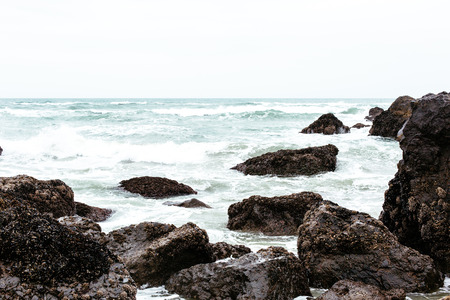 A scenery of rocks at the coastline of the Pacific Northwest in Cannon Beach, Oregon