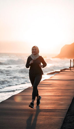 Young muslim woman running at seaside promenade during sunset